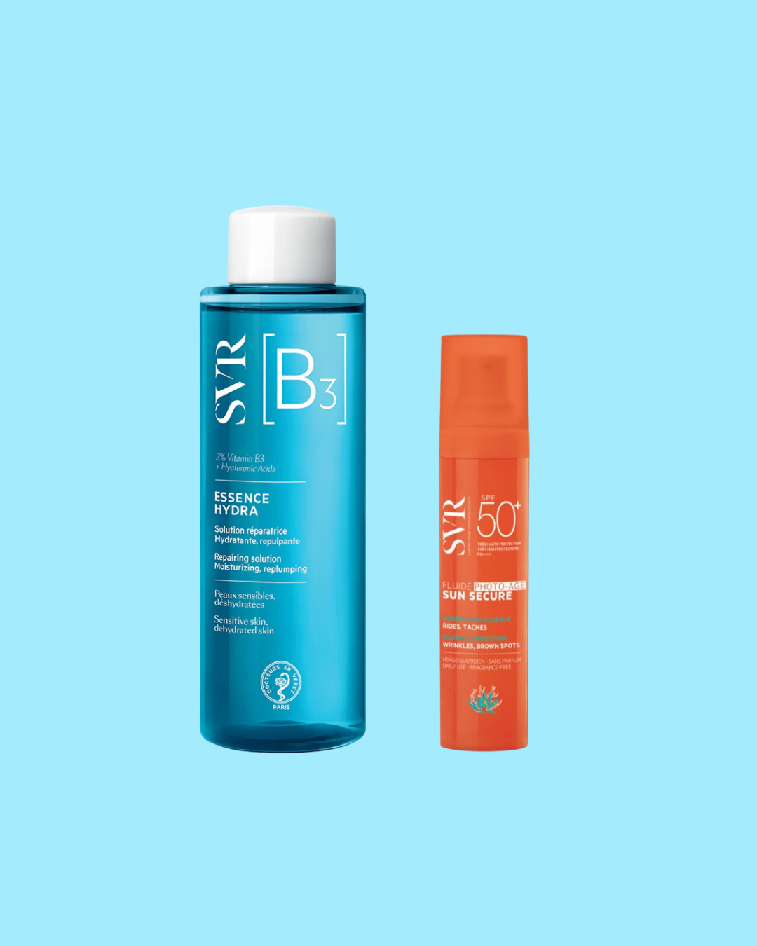 Reforce a sua hidratação com a Essence Hydra B3 e proteja a sua pele com o SUN SECURE Photo Age. Sun Secure Fluide Photo-Age SPF50+ combina uma fotoproteção dermatológica muito elevada e de largo espetro, com proteção reforçada contra os raios UVA*, com ingredientes antienvelhecimento, para suavizar rídulas e rugas, corrigir manchas e refirmar a pele.